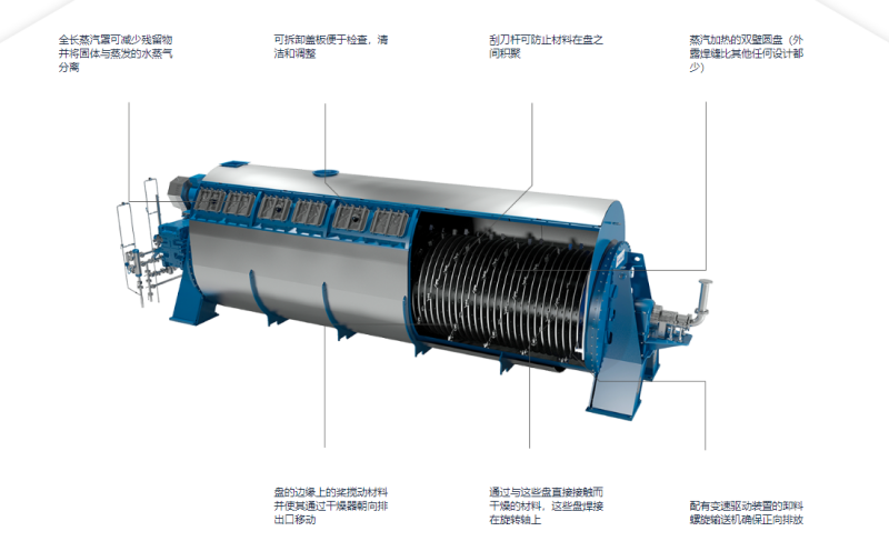 鈦材圓盤干燥機設計合理,結構緊湊,適用范圍廣,生產能力大,產品質量好,效率高,節能。