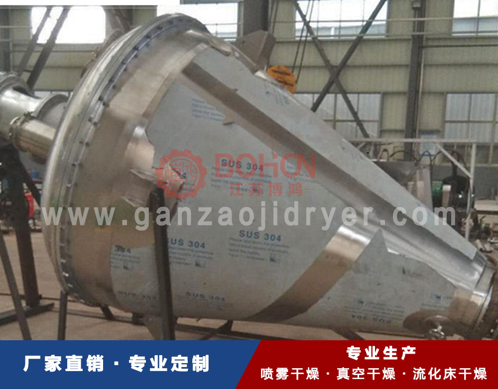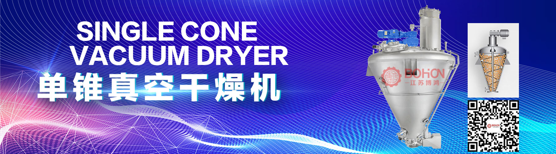 1. 單錐真空混合干燥機中的物料在容器內受熱是緊貼內壁,由螺旋槳葉自下而上旋轉至容器上部,然后沿 主軸呈渦流向下。物料在整個干燥過程中始終在分散運動。物料的運動狀態保證了物料的均衡受熱。